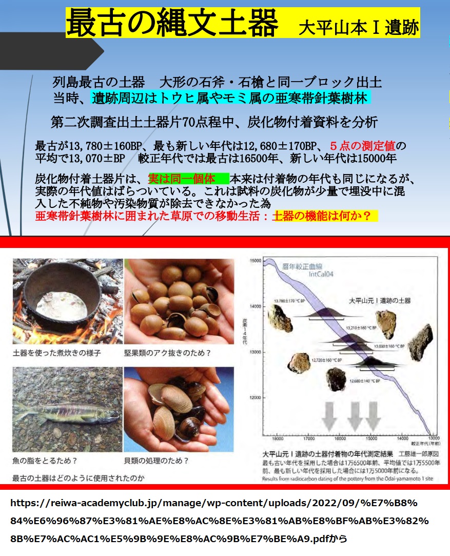 外ヶ浜町のウェブ《世界文化遺産 史跡 大平山元遺跡とは》に中学生が拾った石器から遺跡を発見した経緯から、炭化物付着した「無文土器片」発見までが詳しく述べられています。炭素を含む有機物の年代を測定するC14測定で16500〜15000年前とされました。これはまさに縄文時代が始まった時点です。