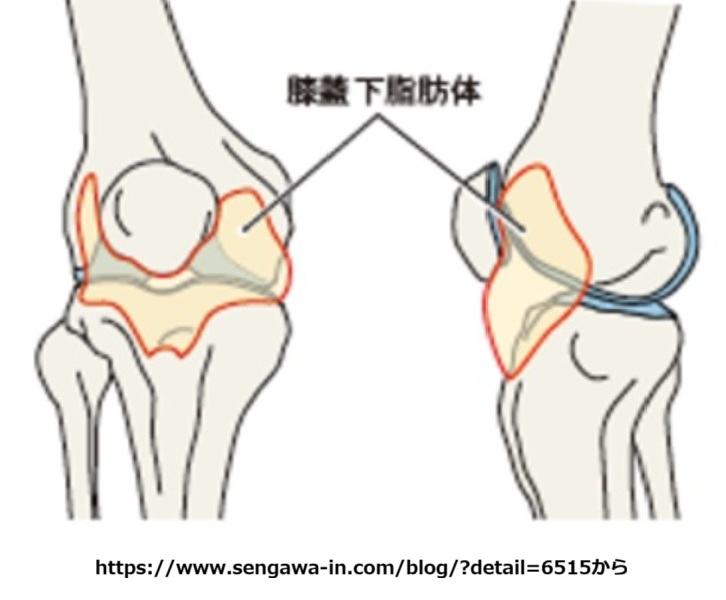 《この脂肪の塊は膝のお皿の動きをスムースにしたり、運動の衝撃を吸収したりするクッションの役割をします。また、この脂肪組織が血管や神経が豊富に通っているのですが、炎症を起こしたり硬くなってしまうと、この神経が刺激されて痛みの原因となることが多い組織でもあります》