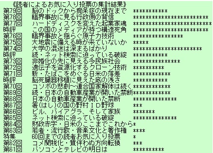 秋口に東海村臨界事故が発生したため、このコラムも年末にかけて、そちらに多くの関心を割きました。でもトップはわずか1票差で77回でした。そのあたりをNさんの感想がうまく語ってくれています。