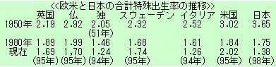 厚生省の国立社会保障・人口問題研究所に、「少子化情報ホームページ」が最近、開設された。そこにある「合計特殊出生率」から抜粋したのが以下の一覧表である。この数字は女性1人が産む子供の平均数であり、「2.08」あれば人口は長期的に維持される。