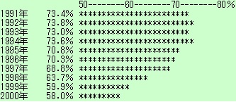 ビールの酒類全体に占める構成比は、国税庁調べで過去10年、このように推移している。2000年は予測であり、実際にはもっと少なくなろう。