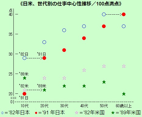 週に16時間以上働く人にアンケートし「レジャー、地域社会、仕事、宗教、家庭」の5部門が、それぞれの個人生活の中でどれくらい重要に思えるか、合計100点になるよう配分してもらう。これを1982年と91年の2回実施した(米国は89年)。日本人と違い、米国人は宗教に10点くらい配分してしまうから、日本の中高年で仕事中心性が断然高いといっても、日米間の差は見た目よりも小さいと考えてほしい。