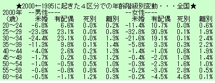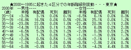 昨年書いた第107回「非婚化の進展をITが阻み始めた」で開発した、世代ごとの未婚率減少傾向を計算する手法を今回も使ってみる。例えば1995年国勢調査で35〜39歳だった世代は、2000年調査時点では40〜44歳になっている。5歳年上に移行していることを考慮して婚姻関係別に整理、差を計算してやる。2000年の東京と全国で1995年からの5年間にどう動いたか比べると下に示す2表のようなる。