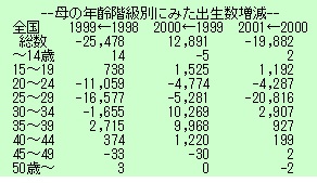 人口動態の概況には出生数が記されている。平成13年概況「2 出生」と平成12年概況「2 出生」とから、母の年齢階級別に出生数増減を抜き出してみた。