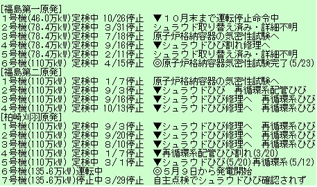 無印5基はどうだろう。福島第一3号機と福島第二1号機は4月段階で早くも原子炉格納容器気密性試験を受けさせたいとアピールがあったのに、5月末に至っても実施情報が無い。福島第二1号機は別の場所にひびがあったと伝えられる。柏崎刈羽7号機も再循環系配管を持たない設計の最新鋭機であり「自主点検でシュラウドひび確認されず」である以上、早期に運転再開して良さそうである。が、最近の定期検査は40日程度で終わるはずなのに、もう60日近くも止まっているのは発表されない不具合があるからではないか。現に福島第一6号機は40日完了ペースで進んでいる。