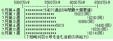 柏崎刈羽6号機の運転再開に合わせて、東電は5月8日「勝俣社長会見要旨(当面の需給見通しについて)」を出している。「7・8月につきましては、6,000万kWを超える需要が発生し、猛暑時には6,450万kWの最大電力が発生するものと予想しております。なおその場合には、供給力は▲850万kW不足する見通しであります」とある。資料から7月を中心に拾い出してみた。