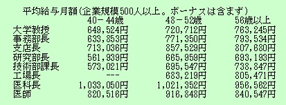 家一軒分の差だが、ある意味で実感しにくい数字だ。そこで上智大経済学部出島研究室の「データを探しに」を紹介する。主題は大学教員の給与だが、次の通り、民間給与の月額ベースで理系と文系の幹部職給与比較になっている。出所は人事院「民間給与の実態−平成8年職種別民間給与実態調査の結果」である。