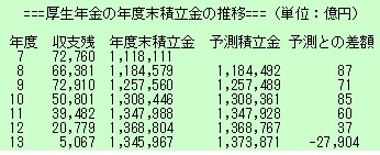 厚生労働省の「年金財政ホームページ」で厚生年金の財政状況を検証しようとして「公的年金各制度の現状」に行き着いた。平成7年度から13年度まで収入、支出、収支残、年度末積立金が手に入る。厚生年金についてだけ下のように書き出してみた。前年度末積立金に当年度の収支残を足して予測積立金とすると、12年度まではほぼ合っているのに、13年度は突然、2兆7千億円も足りなくなる。