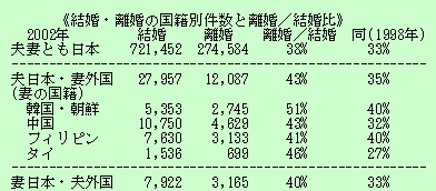 日本が東アジアから結婚相手の女性を迎え入れるようになって、既に20年にもなる。失敗して離婚に至るケースもある。厚生労働省統計情報部の「人口動態統計年報・主要統計表」から公表されている最新2002年の数字を拾って、何が起きているか見よう。ただし、妻の国籍が韓国・朝鮮の場合、在日韓国・朝鮮人が多数を占めている。
