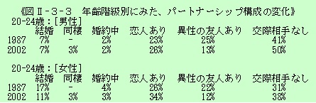 15年前と比較すれば、「恋人あり」や「同棲」が増え、逆に「交際相手なし」も増える、男女交際の両極端化が進んでいる。青春真っ直中、20-24歳の男性に交際相手なしが50%もいるとは、「それほどに仕事漬けなのか」「いったい何をして日を送っているのか」と聞きたくなる。
