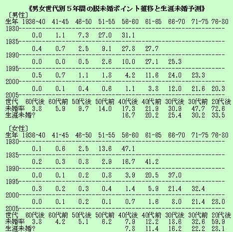 2005年国勢調査の速報集計結果が公表され始め、65歳以上人口の比率21.0%は世界最高、15歳未満人口の割合13.6%は世界で最も低い水準と少子高齢化が歴然とした。しかし、大きな論点が語られていない。2000年国勢調査では独自に分析した結果、出会い系サイトなどが思わぬ力を発揮して第107回「非婚化の進展をITが阻み始めた」を書くほど非婚化に一定の歯止めが掛かった。今回はその傾向が進むかと楽しみにしていたが、結論から言うと、非婚化への歯止めは大きく息切れしてしまい、生涯未婚率上昇が加速した。男性なら今の30代後半は4人に1人、20代後半は何と3人に1人が生涯独身を通す可能性が高い。女性は男性より生涯未婚率は大幅に低かったが、今の20代、30代は同世代男性に急接近しそうである。