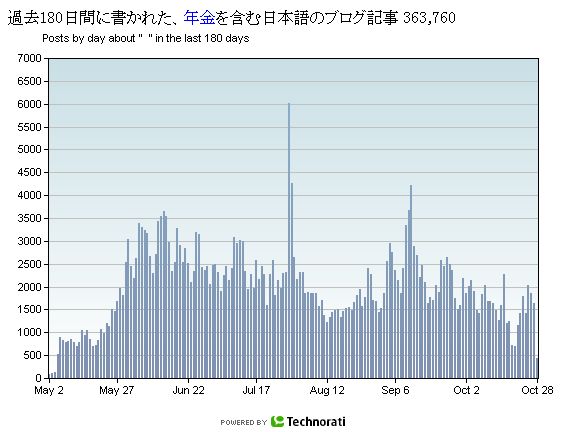 2005年には郵政民営化というシングルイシューが決定的に重要とする小泉首相に対して、新聞メディアはそれなりの異議申し立てをしたが、対する民主党側の選挙アピールは余りに弱々しく、有権者は与党支持に動いた。今回は年金問題が決定的である。「5000万件問題で年金の丼勘定ぶりに唖然 [ブログ時評80]」で使ったテクノラティ社の「年金」記事頻度グラフをもう一度、見よう。さらに「安倍」グラフも並べよう。