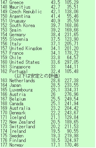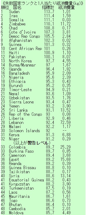 「失敗国家」という言葉を聞かれたことがあるだろう。国家として統一する軸が国民から失われ、行政・警察などの組織も崩壊して国の体(てい)をなさなくなる。ダルフール紛争で有名なスーダンが最近の酷い例だ。フセイン政権を打倒した米国が無理を通して支えているイラクもだ。「failed state」という英語ずばりのランキング「Failed States Index Scores 2007」が社会・経済・政治12指標を10点満点で採点し、合計点の上位から並べている。これと各国1人当たり紙消費量がどれくらい相関するのか見たいと考え、2005年分から数字を拾って当てはめた。その世界177カ国一覧が以下だ。ちなみに紙消費の世界平均は1人当たり54.48kgだった。