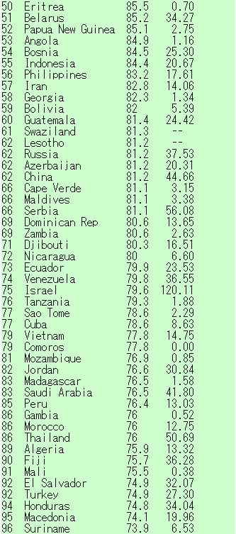スーダンやイラクでさえ紙消費は伸びている中で、消費を減らし、かつ0.02kgと極端に少ないアフガニスタンが目立つ。治安どころでないソマリアも極小の横ばいだ。アフガニスタンの数字はタリバン掃討に部隊を送り込んでいる西側各国の説明とは裏腹に、民生の安定は進むどころか退歩していると疑わせる。0.02kgでは公的な文書すら確保していないかもしれない。
