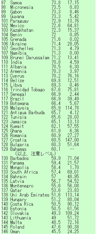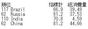世界平均を上回る72kgのレバノンが28位にいる点は例外的であり、中東地域の複雑さゆえで、お気の毒としか言いようがない。しかし、総じて「ぴたり」の印象だ。インデックスは指標計90点以上を「警告レベル」、60点以上を「注意レベル」と設定している。紙消費量の分かれ目からみると「51位、85点のベラルーシ34kg」から下の国は充実しており、80点台後半の国の並びを見ても85点を警告レベルとしても良いと感じた。