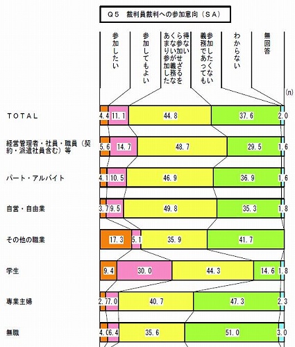 詳しくは「裁判員制度に関する意識調査」結果でご覧になれます。「『参加したい』『参加してもよい』という方のほか,『義務なら参加せざるを得ない』という方まで含めると,20代〜60代の約65パーセントの方が参加意向を示していることが明らかとなりました」と主張するのですが、以下の集計グラフを見てください。選択肢が「参加したい」「参加してもよい」「あまり参加したくないが義務なら参加せざるを得ない」「義務であっても参加したくない」「わからない」の5本しかなく、3本は「参加する」結論、「参加しない」結論は1本しかないのです。このような非対称の選択肢設定は「わからない」層を中間的な答えに誘導する偽計です。二流メディアが自分の主張に説得力を持たせようと予定調和を意図する世論調査によく現れます。裁判員制度タウンミーティングでの「やらせ」多数発覚といい、最高裁が世間常識を知らないことに驚くばかりです。