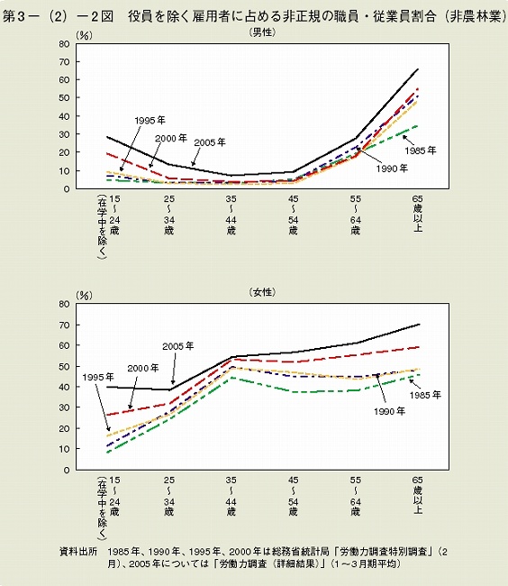 若い男性が急速に痩(や)せ型に移行している事実を伝える「若い男は体形も生活もオヤジ世代と決別 [ブログ時評84] 」を昨秋に書いてから、ずっと宿題になっていたのが急拡大している非正規雇用との関係を調べることでした。海外から見て特異な対立「太る男とやせる女」構図が終焉を迎えたのには、社会的な必然があったのか、押さえて置かねばなりません。「平成18年版 労働経済の分析」(労働経済白書)の「若年者の就業機会をめぐる問題(若年層における非正規雇用の拡大)」に「第3−(2)−2図 役員を除く雇用者に占める非正規の職員・従業員割合(非農林業)」などのデータを見つけることが出来ました。