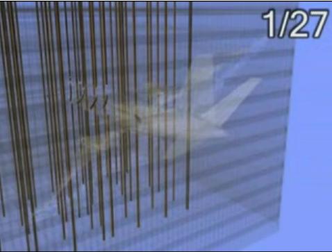 米国同時多発テロで高層ビルが崩壊していくシーンはまだ目に焼き付いています。GIGAZINEに「アメリカ同時多発テロ事件、通称「9.11」を科学的にCGで検証したムービー」が紹介されていて、ブログではあまり話題になっていないようですが、オススメ動画だと思います。あの高層ビル全重量37万トンを外周の柱240本が40%、中心部のコア柱47本が60%の分担で支えていました。パデュー大によるシミュレーション動画から以下に、突入したジェット機がコア柱を切断していくシーンをキャプチャーしてみました。こういうのが前から見たかったのです。