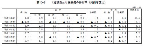 厚生労働省が2007年度の「医療費の動向」をまとめたとのニュースが流れました。「中央社会保険医療協議会 医療費の動向等について」に詳しい資料があります。33兆4000億円で前年度比3.1%、約1兆円の増加です。厚労省は「2007年度は制度改正がなく、医療費の伸びは従来と同水準となった」と分析しているのですが、こういう中身のない、客観的に分析できない言い方にはうんざりです。「平成19 年度の医療費について」からひとつ表を引用します。「表10-2 1施設当たり医療費の伸び率(対前年度比)」です。
