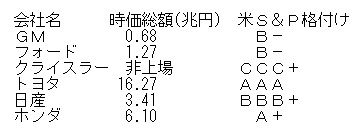 20日付け日経新聞の3面「GM世界再編の焦点に」に掲げられた表「日米自動車大手の株式時価総額と格付け」に改めて、ここまで米国側の危機が進んだのかと思わされました。