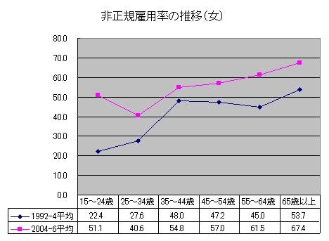 この間に15〜24歳の若者だけ、非正規雇用率が21.7%から43.8%に急上昇しています。年上世代でもわずかに上がっているものの、25〜34歳が12.9%、35〜44歳が6.9%、45〜54歳が8.4%と雇用の安定ぶりは明らかです。では、女性の非正規雇用率はどう動いたのでしょうか。グラフを掲げます。