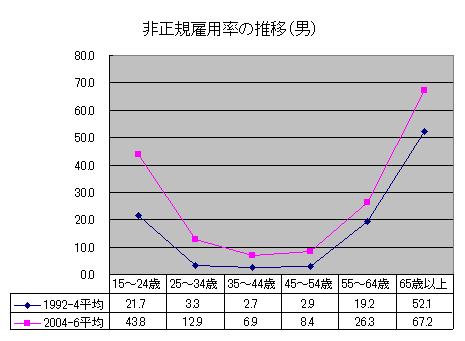 痩せたいと願う若者は存在しているでしょう。しかし、全国規模で人体計測をして、こんな特異な変動が現れるには社会的な要因が背景にあると考えるべきです。ますます太っていく中年世代と違う環境が、若者にはあるはずです。総務省の「年齢階級、雇用形態別雇用者数」でパートタイマーやアルバイト、派遣労働者など、非正規雇用の割合を調べ、人体計測の期間の1992〜94年と2004〜06年で年齢別に平均値を出しました。まず男性についてのグラフを見てください。