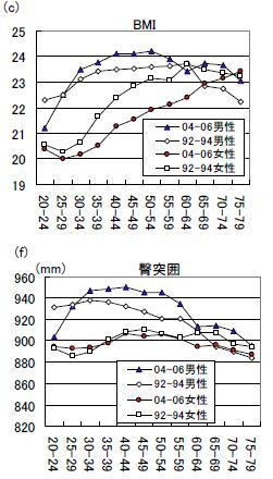 経済産業省が2007年秋に発表した人体データの計測結果「size-JPN 2004-2006」が、この謎解きの発端でした。前回調査(1992〜94年)に比べて30歳以上では男性が太り、女性が痩せる傾向が顕著でした。ここに特異現象が現れました。肥満度を示す「ボディ・マス指数」BMI値とヒップサイズで、20〜24歳の男性は前回を大きく下回り、女性の値に急接近しました。身長170cmを想定すると前回の数値なら標準体重に近い64kg程度だったのに、最近では61kgまで痩せたことになります。発表されたグラフを掲げましょう。