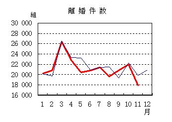 それどころか、1月22日に発表の「人口動態統計速報(平成20年11月分)」を見れば、大不況入りがはっきりした11月は前年を大きく下回る離婚件数になっています。該当のグラフを以下に引用します。赤い折れ線が2008年です。
