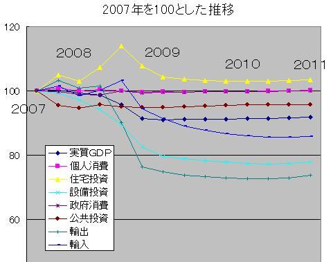 この1〜3月期での落ち込みぶりが最も酷くて、輸出は「76」まで低下、設備投資も「83」に落ちます。GDPは「91」あたりまで下がってから横ばいを続けます。「100」前後にある政府消費や「95」前後の公共投資はほとんど効かないことが読みとれます。輸出や設備投資がやや上向く2010年末に「92」とGDPがわずか上昇して、大不況の底が現れるシナリオです。2011年の1〜3月期段階で輸出「74」、設備投資「78」ですから、景気回復が始まった時で、いかに経済状態が厳しいか想像できると思います。