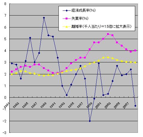 さて、経済激動、大不況突入で失業率急増は必至です。これからどうなるのでしょう。不況が酷すぎれば、離婚しても職がないので離婚できないという事もありそうです。また、近年の社会意識調査の多くが家族を守り、維持する方向を示している事実もあります。博報堂生活総研が最近、提唱している「第三の安心・社会を修理する生活者」は「98年の金融ビッグバンを契機に、GDPは急落。実収入も減少し、完全失業率も4%台へ」「しかし生活者は【賢力】を駆使し、この環境変化に対応します。子供への教育投資や夫婦関係、家族関係の深化、地域生活の見直し」という「まわり固め」があって、さらに「みんなでつくる世の中の安心」へと関心が向いてきたとします。日本の家族の行方を注視しましょう。