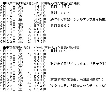 神戸と東京の発熱相談センターに寄せられた電話相談件数の推移を並べてみましょう。人口比が8倍余りあることに留意しても、大型連休明けの状況は似通っています。神戸だけに発熱者が多かったのではありません。