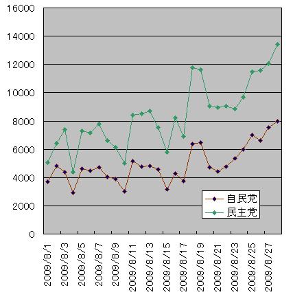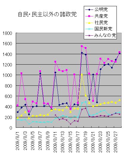 民主と自民両党以外の諸政党は上のグラフのように動いています。公明党と共産党で1日に千数百件、社民党、国民新党、みんなの党で数百件のブログ記事数ですが、序盤情勢調査報道があってから、いずれも上向いています。民主党の独走をチェックできる存在への期待でしょう。ただ絶対的な数の大きさは比較になりません。議席に大きくは効かないはずです。