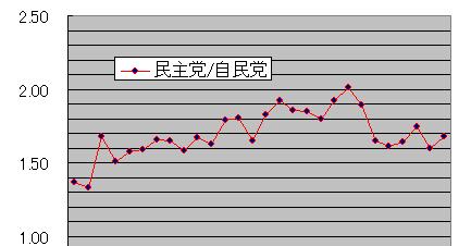 「民主党/自民党」比は最初の「1.3」台から順調に伸び続けて21日に「2.01」の最高値を示しました。その後、急に「1.65」前後まで落ち込んでしまいました。総選挙の主役の座が自民党から民主党にどんどん移っていく様を表していました。しかし、一般に想定された以上の圧勝予測が報道され、それも参院の法案否決を覆せる衆院3分の2、320議席を単独で押さえる模様となると話が違ってきたのでしょう。「今度だけは民主党に入れてみよう」と考える自民支持者に揺れ戻しが起きて不思議ではありません。一方、都市部に多い無党派層は投票直前に態度を決めるケースが多く、この層は民主党への流れをあまり変えないと思います。二つの流れがどうせめぎ合うか、都市部と地方で影響に差が出るでしょう。