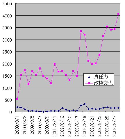 最後に「政権交代」と「責任力」のグラフです。勝敗の帰趨が見えて「政権交代」はますます論じられて1日4000件を超えましたが、「責任力」は100件台とまるで相手にされていません。どこかのコピーライターに頼んで作らせたような非日常造語を掲げて総選挙を戦おうとした発想が異常なのです。2005年郵政総選挙の約束をどう果たしたのか――自民党が政権党である以上は、有権者はそこから説明して欲しかったのですが……。