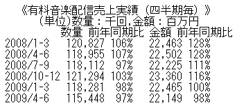 「オリコンシングルチャート、20位が史上初の3000枚割れ…59位からは売上1000枚に満たず」(The Natsu Style)がネット上で話題になっています。ミリオンセラーが当たり前だった1990年代に比べて、あまりに寂しいCD売り上げ減への感慨ですが、気になって調べるとCDに取って代わるはずの有料ネット配信も今年になって落ち始めていました。CDの売れ行き不振は加速していますし、世界不況が個人の懐具合まで締め付けて、音楽不況に追い打ちを掛けているとみるべきでしょう。