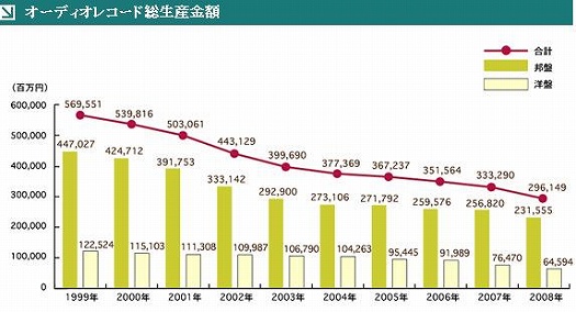 上のグラフは日本レコード協会の「過去10年間の生産実績・オーディオレコード総生産金額」からの引用です。これは音楽ビデオまで含む音楽ソフト全体を表しています。1999年の5695億円から2008年の2961億円まで本当に転げ落ちています。「音楽ソフト種類別生産金額の推移」も参照すると、ピークだったのは1998年の6074億円ですから、2008年は半分以下になっているのです。
