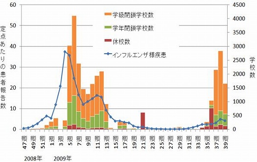 下に引用したグラフは「2009〜2010」と「2008〜2009」を比べる設定です。10月4日の「中規模流行」が10月11日には「大規模流行」にはね上がっています。2番目のグラフは国立感染症研究所感染症情報センターの「新型インフルエンザA(H1N1)の流行状況−更新17」からの引用で、集計に時間がかかるので9月27日分までしか出ていません。