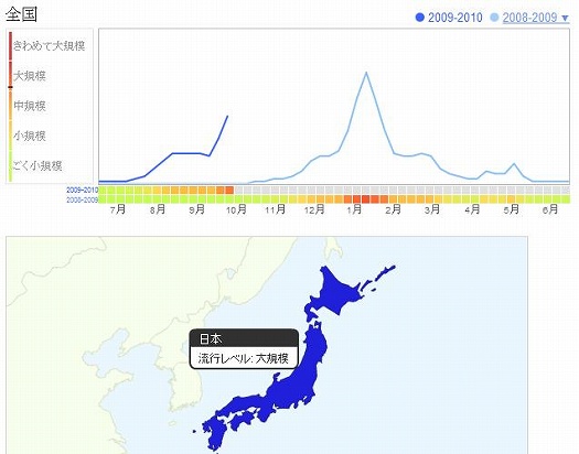 特定キーワードを持つブログ記事数の推移を見て世論動向をつかむ試みを、夏の総選挙でしています。まとめた結果は「衆院選ブログ観測(4)4年前が政権交代の伏線 [BM時評] 」にあります。ブログを書く行為は全有権者からみて一部の人にすぎませんが、「民主党が単独で3分の2超」との予測報道で自民党側にやや揺れ戻された有権者の動向が反映されました。ブログに比べグーグル検索を利用する人の数は遙かに多いでしょう。患者発生という物理的な動きが、心配などの心理を通して検索数に表現されるとみていいと思います。グーグルは膨大な過去の検索記録を保存しています。「宝の山」からまだまだ色々な発掘がありそうです。