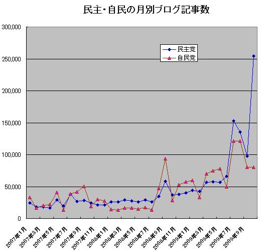 8月の総選挙で政権交代が決まってから2カ月が過ぎました。総選挙期間中には「衆院選ブログ観測(4)4年前が政権交代の伏線 [BM時評]」など、毎日調べた結果から一連のブログ観測を発表しています。今回はもう少し長い視野で2007年始めからの動きを、「民主党」と「自民党」のキーワードを持つブログ記事数の推移から分析しました。手法はグーグルのブログ検索で「日付を指定」を利用、2007年1月から毎月の記事数をリストアップしました。なお、このデータは10/31夜に採取したもので、11/1朝には再現しない部分があります。再現性については最後に議論します。まず、グラフを見てください。