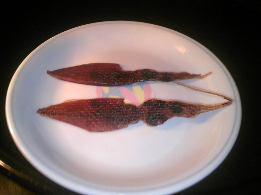 店頭の試食ではライターで炙ってくれます。能登半島特産の「いしる醤油」で漬け込んでから干してあり、炙ることでイカの内臓を使った醤油の風味が引き立ちます。しかし、タバコを吸わない私はライターを持っていないので、電子レンジの活用を思い立ちました。写真はそのために小皿に入れた状態です。透けて見える内臓が美味しそうでしょう。レンジの出力で変わりますが、1匹10秒内外です。
