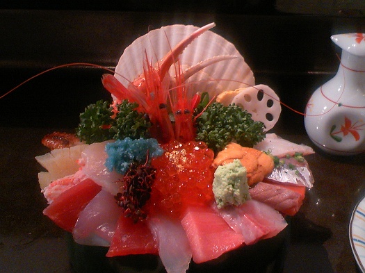 20種類以上のぴちぴちした寿司ネタが器からこぼれるように並んでいます。お店の人から「お刺身感覚で食べてください」と言われます。その心は「丼」なのに、しばらくは器の中にあるご飯に到達しないのです。