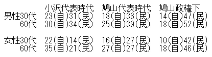 まず、内閣支持率が早くも50%前後にまで低下したことを重大視する方たちがいます。この数年、自民党内閣の支持率が発足からつるべ落としのように下がって、政権投げ出しにつながってきた事実が頭にあるのでしょう。よく思い出してください。支持率低下が次の国政選挙で敗れることに直結していたから起きていたことです。22日にリリースした「女性の支持層形成で民主盤石〜朝日新聞分析」から小沢代表時代(昨年9月から今年4月)と鳩山代表に代わった5月から、さらに鳩山政権になってからの3時期でみた民主党と自民党の平均支持率データを再録しましょう。
