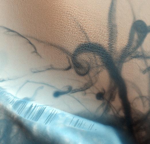 写真はNASAのMars Reconnaissance Orbiter (MRO)が2006年から撮っているものです。高度は300キロ前後と言います。Google Marsでの地点とリンクがはって対照できるようになっています。遠くから見れば茫漠とした地形の中に、画家やデザイナーが作りだしたようなシュールな模様が存在している訳です。