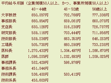 この表は「インターネットで読み解く!」第143回「巨額な発明対価判決が映すもの」で使った平成8年職種別民間給与実態調査と形を合わせていますから、部長級以上では過去13年をはさんだ比較が出来ます。比べてみると56歳以上の事務部長(793,534円)や支店長(807,680円)が、現在では大幅に給与カットされていると知れます。不況による幹部社員の給与カットかも知れませんが、理系側はあまり目立ちません。多少は理系・文系の給与格差が縮小しているようです。