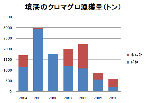 こうした記事を書いている水産庁担当記者が官庁情報以外に目を向けていないからです。「勝川俊雄 公式サイト」の「クロマグロの日本海産卵群は壊滅的」から、鳥取・境港でのクロマグロ漁獲の推移を表すグラフを引用します。