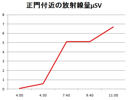 12日午前4時に0.07マイクロシーベルト毎時だった線量は4時半に0.59、7時40分には5.1、11時には6.7にも達しました。通常の値は0.05にも足りないようなので、周辺環境は百倍以上の放射線量になっています。また、中央制御室では通常の1000倍、150マイクロシーベルト毎時と伝えられていますから、敷地境界の正門で22倍しか薄められていない訳です。これは「だだ漏れ」と表現して良いレベルです。放射線管理区域のバリアが破られている上に、内部に桁違いの大放射能暴露がある証拠です。