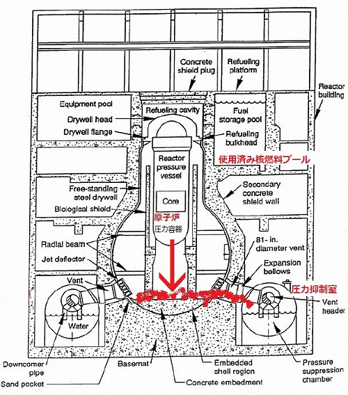 これまで爆発があったのは建屋の上部ですが、今回の圧力抑制室は最も下部に設けられています。炉心で発生した軽い水素ガスは建屋上部に向かいます。下の圧力抑制室に水素ガスがあるためには、核燃料が溶け高温になって圧力容器を破り、格納容器の底をはって圧力抑制室に流れ込むしかありません。