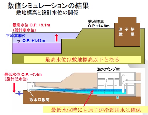 上の図は東北電力が出している「女川原子力発電所における津波に対する安全評価と防災対策」から引用しました。敷地ぎりぎりまで津波が迫れば表面は無事でも建屋地下にある海水ポンプ室なども水で満たされ、津波の力で突き上げられる構造であることが分かります。標高が低い福島原発の場合は海水が建屋地下からも噴き上げる状況が考えられ、内部設備にも大きな被害が出ているはずです。