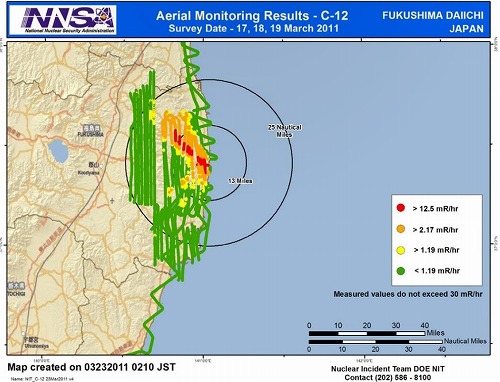 【3/25追補】原発近くの詳しい汚染状況を具体的に示すデータが日本からは出ていません。米国が航空機で17〜19日に調べた結果《Radiation Would Have Spurred U.S. Evacuation .》が衝撃的でした。特に北西方向では20キロの範囲を超えて高い汚染があります。汚染地図を引用しておきます。原発から遠い地点で、しかも粗い点でおさえる日本の放射線モニタリング態勢は問題ありです。