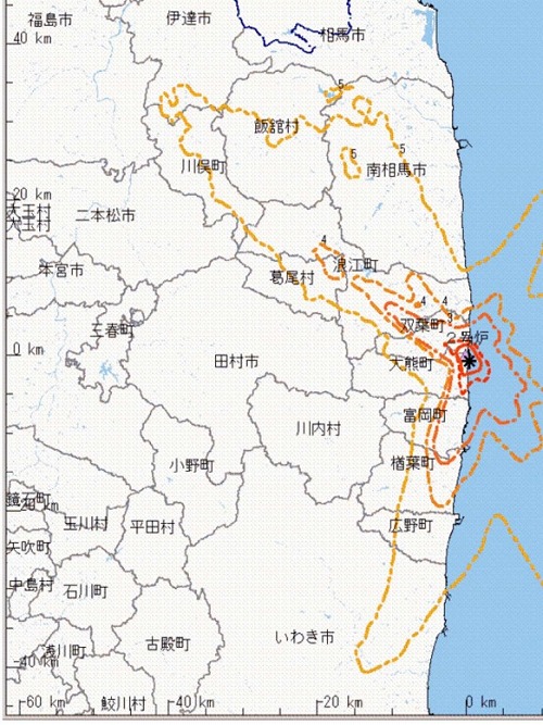 SPEEDIはヨウ素被曝で試算していて意味が判然としなかったのですが、環境汚染地図だと割り切ればよいのです。北西30キロ地点とは浪江町から葛尾村にある飛び地のレベル「4」スポットでしょう。その内側、双葉町、大熊町、富岡町にかけてレベル「3」(2倍)、レベル「2」(10倍)と高い汚染の領域が広がります。上のグラフにプロットされるべき、チェルノブイリでのやや低め汚染に相当する地点がそこにあります。